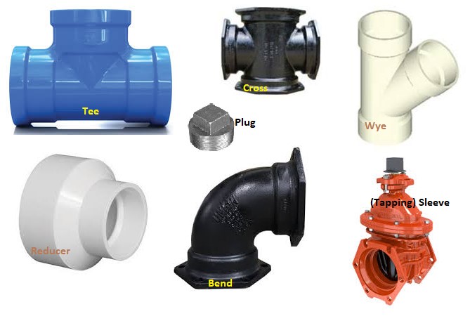 Description: <DIV STYLE="text-align:Left;"><DIV><DIV><P><SPAN>Various water main fittings:</SPAN></P><P><SPAN>Tee - can connect pipes of different diameters or change the direction of a pipe run, or both. Three connections.</SPAN></P><P><SPAN>Bend - connect pipes to change the direction of a pipe run. Two connections. </SPAN></P><P><SPAN>Cross - connect pipes to change the direction of a pipe run or different diameters. Four connections.</SPAN></P><P><SPAN>Reducer - connect two pipes of different diameters. Usually leads from larger to smaller diameter pipe.</SPAN></P><P><SPAN>Wye - connect three pipes, potentially with different diameters. Configured in a "Y" shape.</SPAN></P><P><SPAN>Sleeve - Tapping Sleeves are used when tapping into a pipe while it is under pressure. </SPAN></P><P><SPAN>Plug - used to end a water main at an unused section.</SPAN></P><P><SPAN /></P></DIV></DIV></DIV>